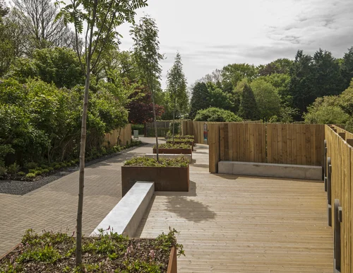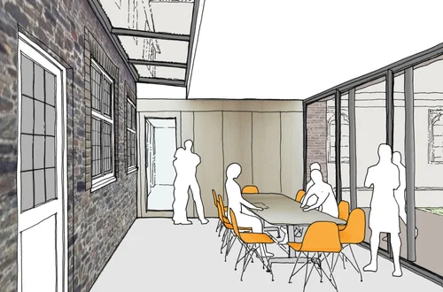 A largely glazed, flat-roofed two storey section, with a projecting balcony, links the mono-pitch section of the new extension to the Victorian part. This connecting structure incorporates a section of rebuilt external stonework within the space.